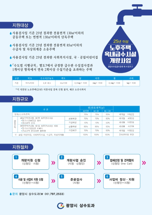 한편, 광양시는 2019년부터 지난해까지 7년간 국·도비 3억 5,000만 원을 포함한 총 33억 3,000만 원을 투입해 10,073세대의 옥내급수관을 개량해 왔다.
