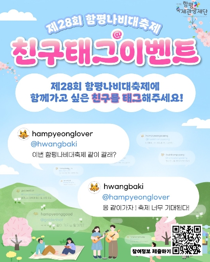 참여 희망자는 함평축제관광재단 인스타그램을 팔로우한 뒤, 게시글 댓글에 함께 방문하고 싶은 지인을 태그하고 ‘축제에 함께 가자’는 메시지를 남기면 된다. 태그된 이용자가 댓글에 답글을 작성하고, 네이버 폼을 통해 개인정보를 제출하면 참여가 완료된다.