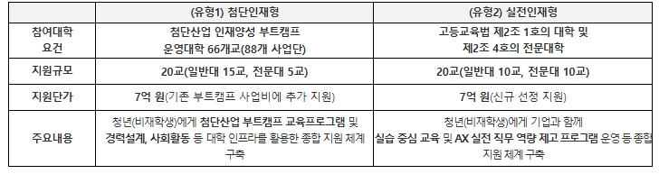 첫째, 첨단인재형은 기존 첨단산업 인재양성 부트캠프 운영 대학의 지원대상을 비재학생 청년까지 확대하는 유형으로, 20개교(일반대 15개교, 전문대 5개교)를 선정할 계획이다. 인공지능(AI), 반도체, 이차전지, 디스플레이, 바이오, 항공우주, 미래차, 로봇 등 첨단산업 분야를 중심으로, 기존의 교육 기반과 대학-기업 협력체계를 활용하여 청년의 첨단분야 실무 역량을 높일 계획이다.