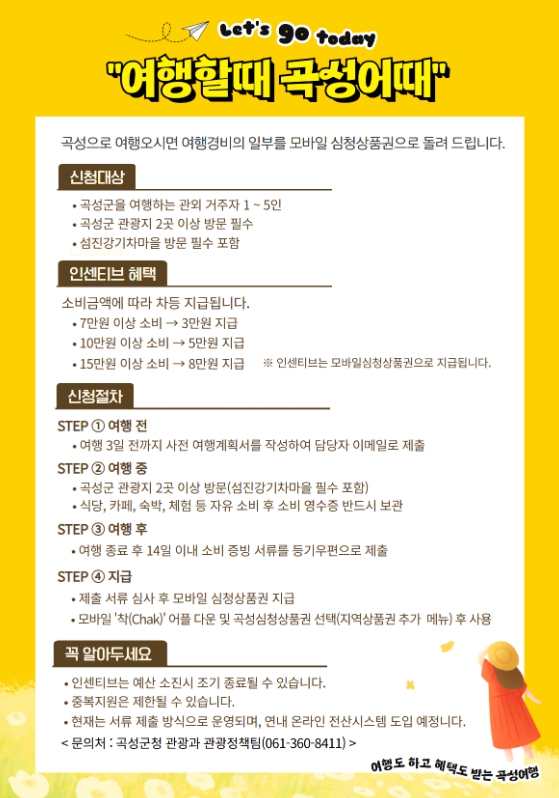 군 관계자는 “여행하면서 쓴 돈이 다시 혜택으로 돌아오는 구조인 만큼, 곡성을 천천히 즐기며 머무는 여행을 계획하신 분들께 특히 추천한다”라며, “앞으로도 여행객이 체감할 수 있는 실질적인 혜택을 계속 확대해 나가겠다”라고 전했다.