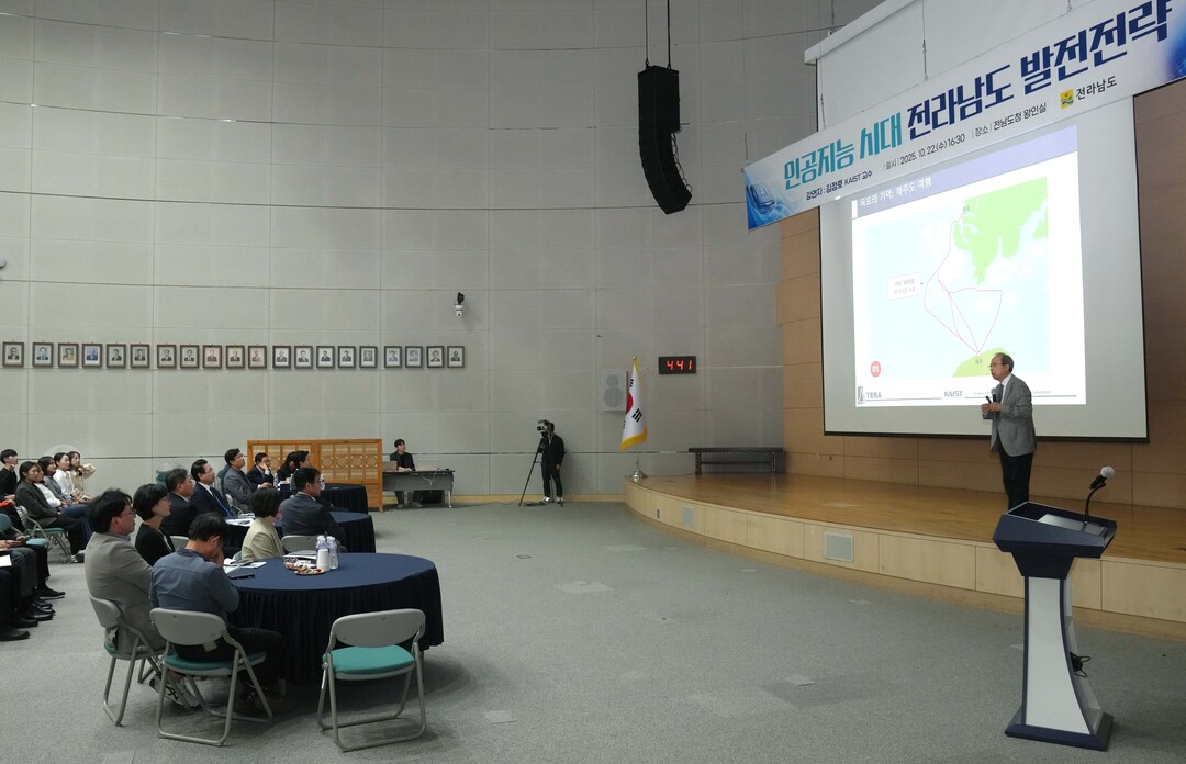 전라남도는 10월 22일 도청 왕인실에서 ‘인공지능 시대 전라남도 발전전략’을 주제로 김정호 카이스트 교수 초청 강연을 열고, 인공지능(AI) 기반의 지역 발전 방향을 모색했다.