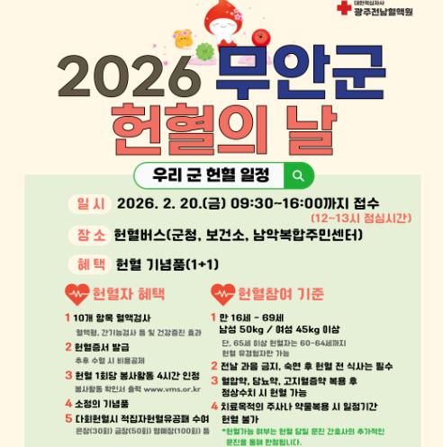 나상현 무안군 보건행정과장은 “정기적인 헌혈 참여를 통해 혈액 수급 안정에 보탬이 될 수 있도록 하겠다”며 “학교와 지역 단체 등과 협력해 참여 안내를 이어갈 계획”이라고 말했다.