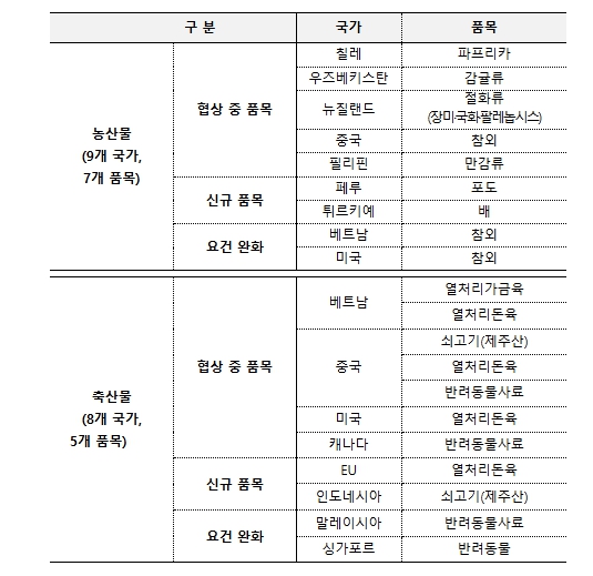 ① 딸기(브라질), 단감(중국), 포도(필리핀), 쇠고기·돼지고기(싱가포르), 반려동물사료(베트남·인도네시아), 필리핀(열처리돈육가공품) 등