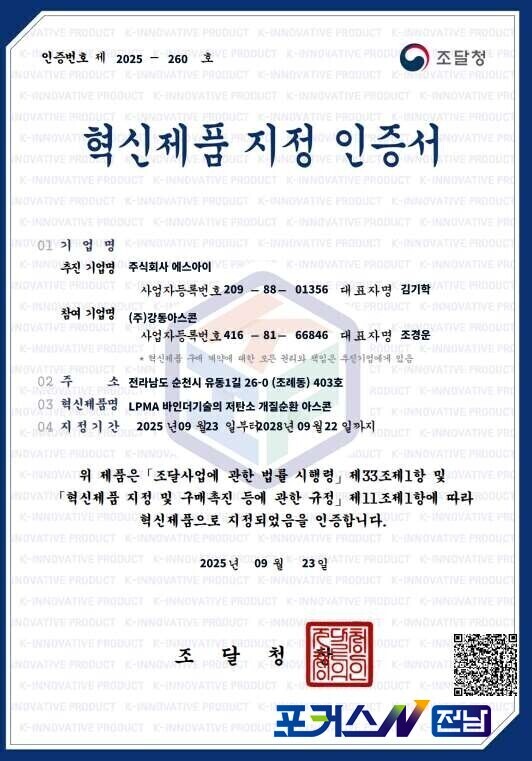 광주지방조달청은 지난 27일 발표한 ‘2025년 제4차 혁신제품 지정’ 결과, 전남 나주의 ㈜윈가람과 순천의 ㈜에스아이(SI)가 신규 지정됐다고 밝혔다.
