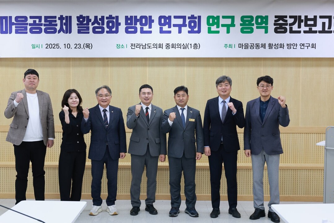 전라남도의회 의원연구단체 ‘마을공동체 활성화 방안 연구회’(대표의원 최정훈)는 10월 23일 도의회 중회의실에서 「지속가능한 지역사회를 위한 주민주도형 마을공동체 활성화 모델 연구」 정책연구용역 중간보고회를 열었다.