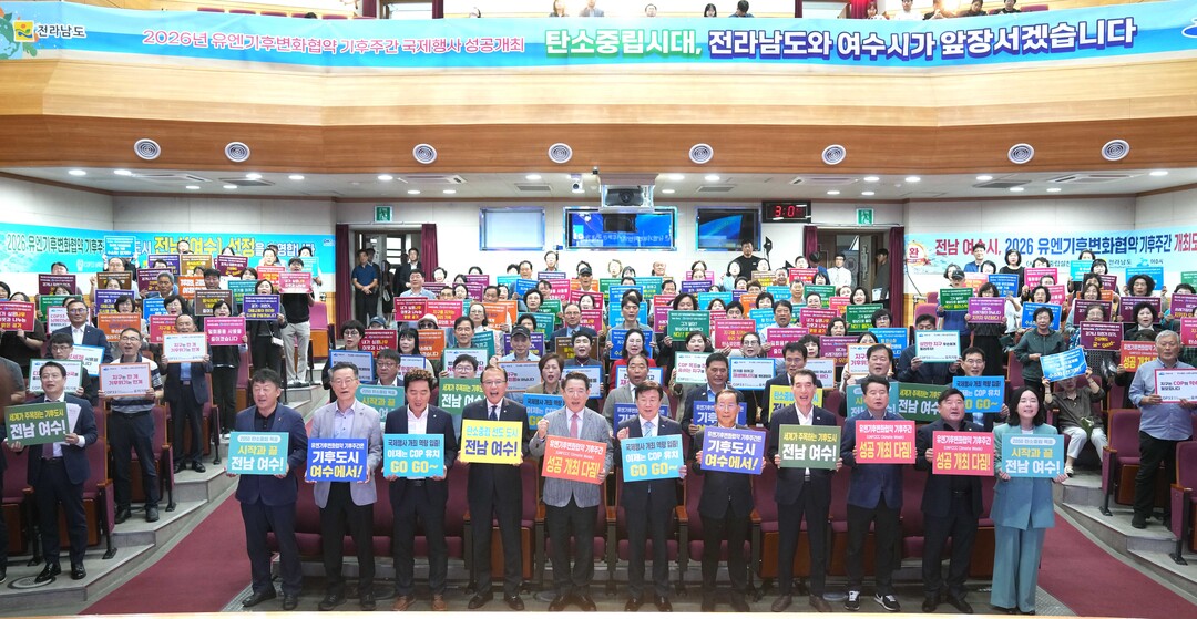 전라남도는 14일 여수 진남문예회관에서 ‘2026년 유엔기후변화협약(UNFCCC) 기후주간’ 국내 개최지로 여수가 선정된 것을 기념하는 행사를 열고, 성공개최를 다짐했다.