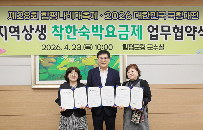 함평군은 “지난 23일 관내 숙박업소 대표자들과 지역 경제의 선순환 구조를 만들기 위한 ‘착한 숙박 요금제’ 운영 업무협약(MOU)을 체결했다”고 26일 밝혔다.