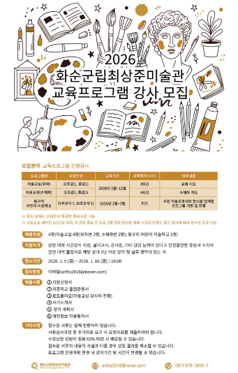 이번 강사 모집은 성인 대상 미술 교육 프로그램인 ‘미술교실’과 어린이 대상 프로그램인 ‘동구리 어린이 미술학교’ 운영을 위한 것으로, 미술을 통해 지역 주민과 어린이의 창의성과 예술적 감수성을 키워줄 역량 있는 강사를 선발할 계획이다.