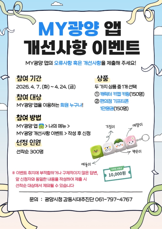이번 이벤트는 ‘MY광양’ 앱 이용자의 의견을 수렴해 시스템 오류를 개선하고 사용자 중심의 기능을 강화하기 위해 마련됐다.