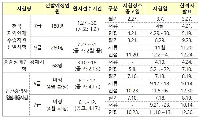이 밖에 민간경력자 일괄채용시험(5·7급)의 선발인원은 각 부처 수요조사를 거쳐, 오는 4월 17일 확정 공고될 예정이다.