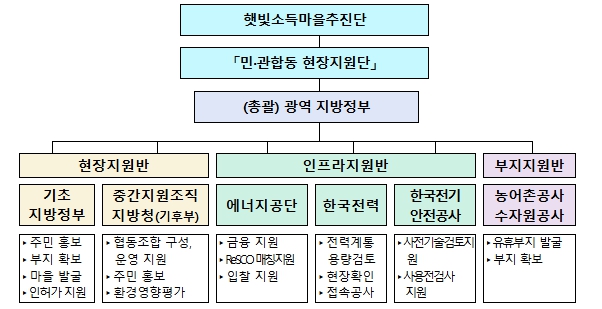 이번에 출범한'민·관합동 현장지원단'은 마을이 새로운 소득원을 만들고공동체 기반을 강화하는 한편, 에너지 자립도를 높일 수 있도록 현장에서 사업 신청부터 완료 시까지 모든 과정을 현장에서 직접 돕는다.