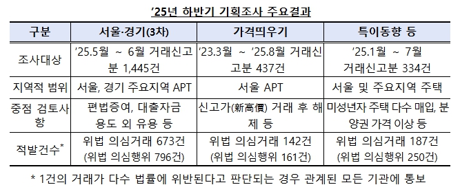 이번 기획조사는▴서울·경기 주택 이상거래(’25.5월~6월 거래신고분),▴부동산 실거래가 띄우기(’23.3월~’25.8월 거래신고분), ▴특이동향 등(’25.1월~7월 거래신고분) 3가지 분야에 대해 실시됐다.