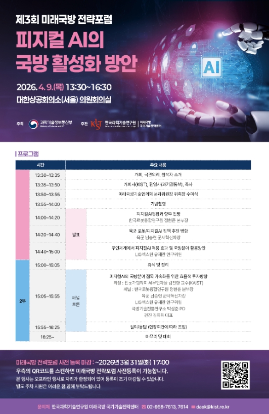 이 토론회(포럼)는 매년 유망한 기술 분야를 선정하여 국내외 동향을 공유하고, 민간 첨단기술을 국방 기술개발에 신속하게 적용하기 위한 국방 연구개발(R&D) 투자전략을 모색하고 있는데, 올해는 특히 국방 분야의 새로운 전환점이 될 수 있는 물리적 인공지능(피지컬AI)을 핵심 주제로 선정했다.