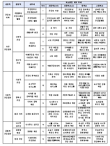 교육부는 현장 의견을 기반으로, 학교에서 활용할 수 있는 교사용 지도서를 개발·배포한다. 이번에 배포하는 지도서는 초등학교부터 고등학교까지 건강증진 교육을 체계적으로 운영할 수 있도록, 시도교육청과 학교의 의견을 수렴해 학교급 전체를 아우르는 주제 영역을 선정했다. 또한, 개발 과정에 학교급별 교원이 직접 참여하여, 상급학교 진학에 따라 학교급에 맞게 건강증진 주제 영역의 교육 내용이 연계·확장되도록 구성했다.