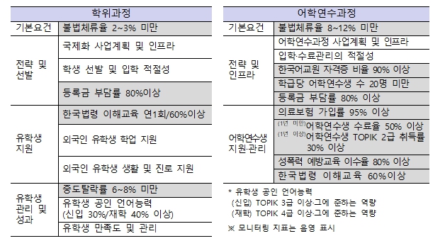 주요 점검 내용은 ▴외국인 유학생 선발의 적정성 ▴유학생 대상 한국어교육 및 생활 지원 ▴출결 및 학업 지원 등 학사관리 전반 ▴유학생 체류 관리 및 사증(비자) 관련 준수사항 등으로, 관리 과정 전반의 실태를 점검한다.