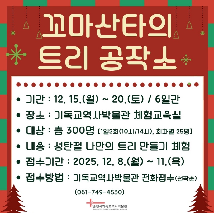 이번 프로그램은 성탄의 의미를 함께 나누고 추억을 만들기 위한 체험형 프로그램으로 참가자들이 나만의 소형 크리스마스트리를 직접 꾸미고 완성하는 활동으로 구성된다.