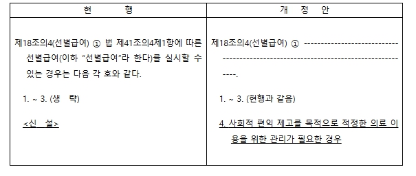 이번 개정령은 국정과제로 추진 중인 과잉 우려 큰 비급여 항목을 건강보험 체계 내에서 관리하는 ‘관리급여’의 법적 근거 마련을 위해 개정됐다. '국민건강보험법 시행령' 제18조의4 제1항 선별급여 실시 대상에 “사회적 편익 제고를 목적으로 적정한 의료 이용을 위한 관리가 필요한 경우”를 추가하여 비급여 중 적정한 관리가 필요한 항목들을 선별급여의 한 유형인 관리급여로 편입했다.