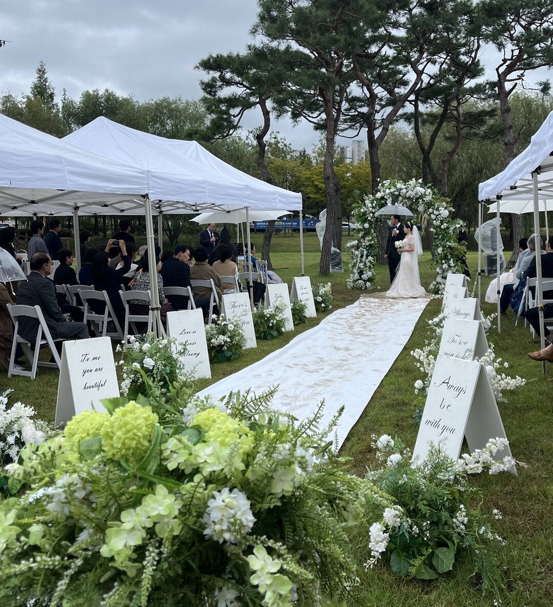 빛가람호수공원에서 열린 2호 커플의 결혼식은 가을비가 내리는 날씨 속에서도 영화 ‘어바웃타임’을 연상시키는 따뜻한 분위기 속에 진행됐다. 하객들은 “비마저 축복이 된 낭만적인 결혼식이었다”며 감동의 소감을 전했다.