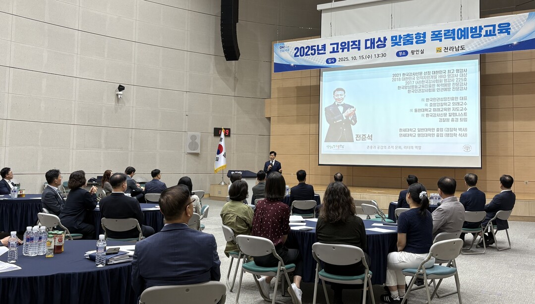 전라남도는 15일 도청 왕인실에서 고위직 공무원을 대상으로 ‘맞춤형 4대 폭력 예방교육’을 진행했다. 이번 교육은 성희롱, 성매매, 성폭력, 가정폭력 등 직장 내 폭력 예방을 위한 인식 개선과 함께 존중과 공감의 조직문화 확산을 목표로 했다.