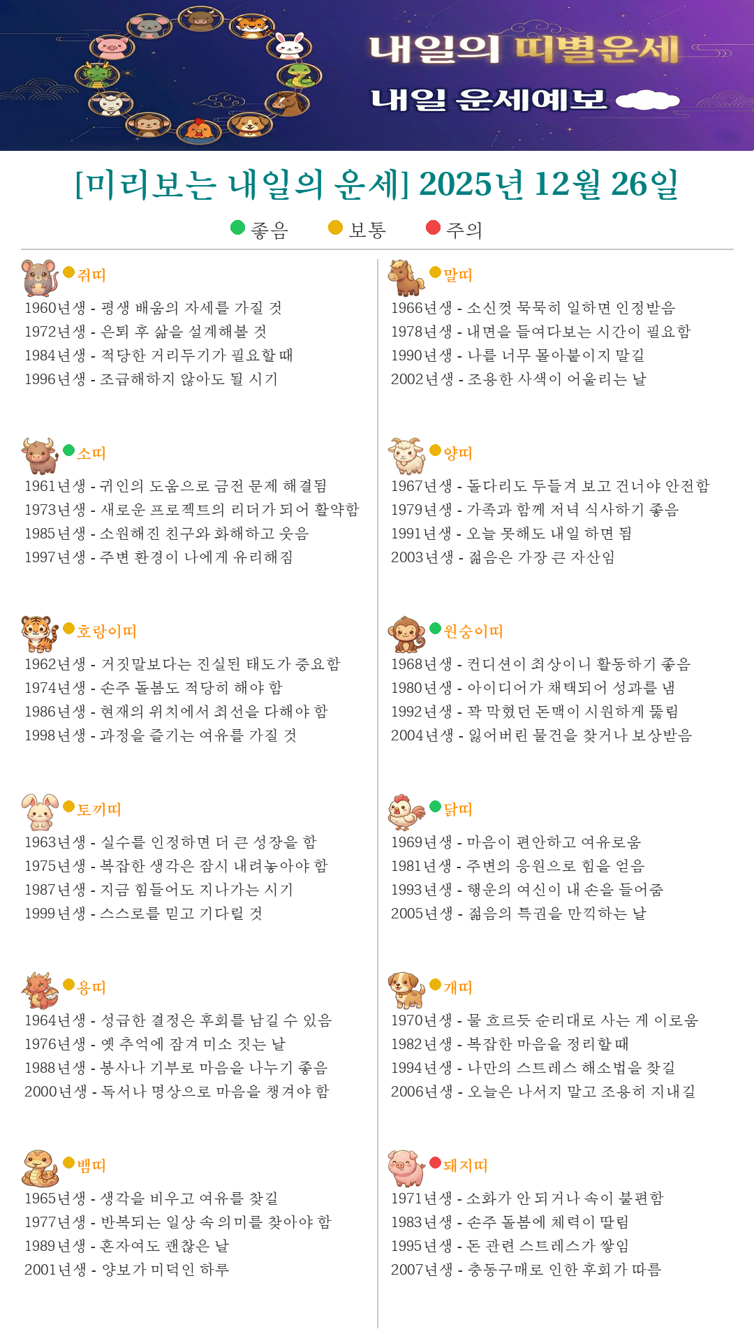 | 하루를 버텨낸 하루, 우리는 내일을 걱정하지만 정작 내일을 준비할 여유는 갖지 못한 채 집으로 향합니다. 지역에서 살아가는 청년의 하루 역시 크게 다르지 않습니다. 포커스N전남은 ‘미래를 맞히는 운세’가 아니라, 내일을 조금 더 단단하게 살아가기 위한 마음의 점검으로 띠별운세를 다시 해석합니다.〈출근전 미리보는 내일의 띠별운세〉는 오늘의 피로를 정리하고, 내일의 선택을 차분히 바라보자는 취지에서 출발했습니다. 오늘도 고생 많으셨습니다. 내일은, 지역에서의 삶이 조금 더 나아지길 바랍니다.[편집자주] |