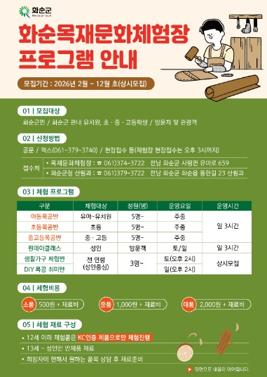 프로그램에 참여를 희망하는 개인 또는 단체는 2월부터 12월까지 목재문화체험장 또는 화순군청 산림과 산림소득팀으로 문의하면 된다.