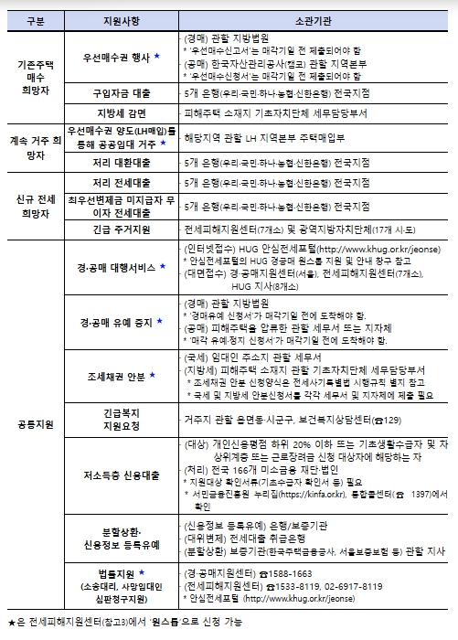 전세사기로 어려움을 겪고 있는 임차인은 거주지 관할 시・도에 피해자 결정 신청을 할 수 있고, 위원회 의결을 거쳐 피해자로 결정된 자는 주택도시보증공사(HUG) 전세피해지원센터(대면・유선) 및 지사(대면)를 통해 지원대책에 대한 자세한 안내를 받을 수 있다