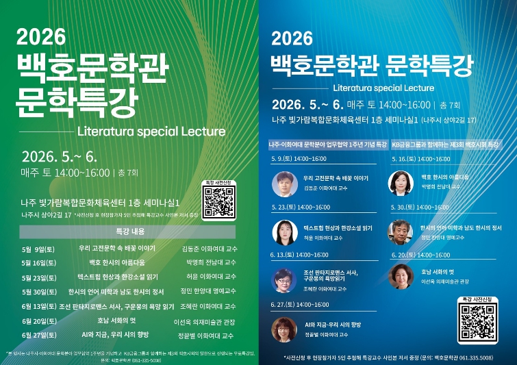 문학특강은 5월 9일 김동준 교수의 ‘고전문학 속 배꽃 이야기’를 시작으로 5월 23일 허윤 교수의 ‘텍스트힙 현상과 한강 소설 읽기’, 6월 13일 조혜란 교수의 ‘구운몽의 욕망 읽기’, 6월 27일 정끝별 교수의 ‘AI와 현대 시의 방향’ 등 다양한 주제로 이어진다.