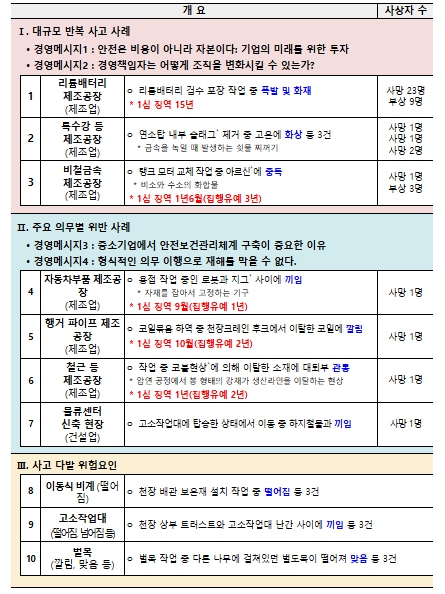 「2025 중대재해 사고백서」에서는 ▴최근 발생한 화재 ‧ 폭발, 중독사고에서 다수 사상자가 발생한 원인을 다각적으로 분석하고, ▴3차례 이상 사고가 발생한 사업장 사례를 통해 사고 재발의 근본 원인도 짚어본다. 이외에 ▴중대재해가 다수 발생하는 이동식비계, 고소작업대, 벌목 작업 시 사고 사례 및 안전 수칙도 함께 살펴본다.