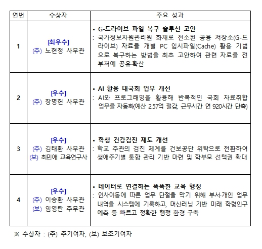 ‘우수’ 수상자인 ▲장명헌 사무관은 인공지능(AI)과 코딩을 활용해 국회 요구자료 관리 체계(시스템)를 자동화함으로써 2.57억 원의 국가 예산을 절감하고 연간 920시간에 달하는 업무 시간을 단축하는 것으로 추산된다. 앞으로 이러한 운영체계를 다른 부처에서도 활용할 수 있도록 확산하여 정부의 업무 생산성을 높이는 데 노력하겠다고 밝혔다. ▲김태환 사무관은 건강보험공단 위탁 형태의 학생 건강검진 제도개선 시범 사업을 2차례 안정적으로 추진하고, 이를 전국 모든 학교로 확대할 수 있는 기반을 마련했다. ▲이승환 사무관은 문서에 머물던 업무 정보를 체계적으로 정리하고 흩어진 교육자료(데이터)를 하나로 연결하여, 불필요한 행정력 낭비를 줄이는 등 자료(데이터) 기반 행정 혁신에 기여했다. 앞으로 국민과 직원들이 보다 편리하게 ‘교육데이터맵’을 활용할 수 있도록 정보를 관리하고 다른 부처와도 협력해 나갈 예정이다.
