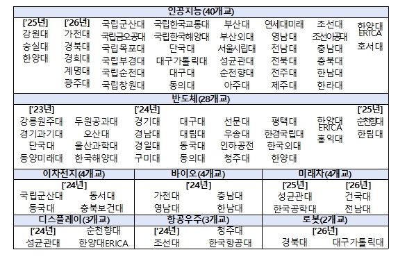 2026년에는 피지컬 인공지능(Physical AI) 시대, 중요성이 증대되고 있는 로봇 분야 2개교, 미래차 2개교를 선정했다. 또한 인공지능(AI) 분야 37개교는 지역별로 기업 수요에 기반한 인공지능(AI) 인재가 양성될 수 있도록, 비수도권 30개교(대경권 6개교, 동남권 6개교, 충청권 6개교, 호남권 6개교 및 강원·전북·제주 6개교), 수도권 7개교(서울 3개교, 경기·인천 4개교) 등 권역별로 선정했다.