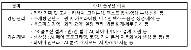 국내 유망 AI 벤처·스타트업을 대상으로 3월 9일부터 27일까지 AI 솔루션을 공모하여 총 370개를 접수했고, 접수된 370개 중 전략 기획, 마케팅·경영 등 ‘경영·관리 분야’에 270여개, 데이터·인프라, 프로그래밍 등 ‘기술·개발’ 분야에 100여개가 모집됐다.