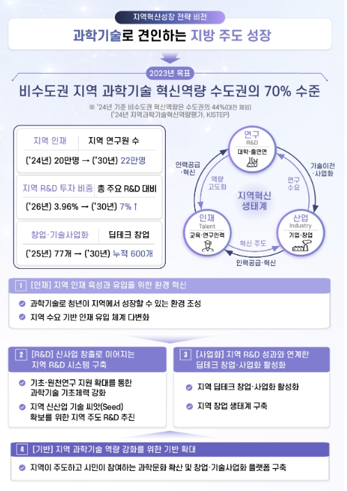 구체적으로 2030년까지 비수도권 지역 과학기술 혁신역량을 수도권 대비 70% 수준으로 확대하고, 지역 연구인력 2만 명 이상 확충, 국가 주요 R&D 투자 대비 지역 R&D 비중 2배 이상 확대, 딥테크 창업기업 600개 이상 신규 창출을 추진할 계획이다.