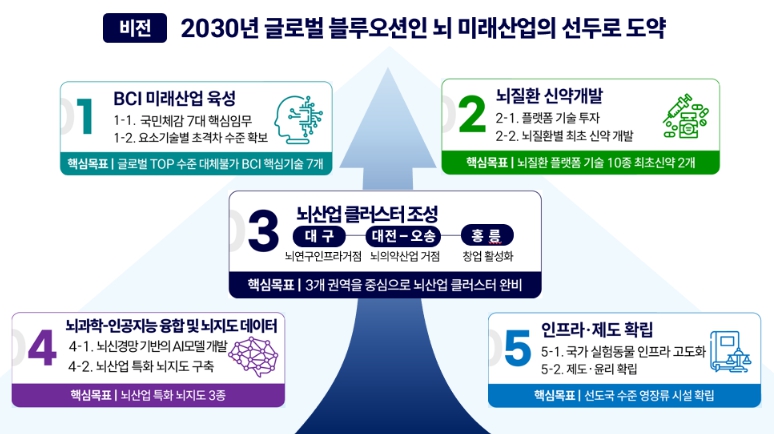 정부는 이처럼 태동하고 있는 뇌-컴퓨터 인터페이스(BCI)와 같은 뇌 미래산업의 선도자(퍼스트무버)가 될 황금시간(골든타임)을 놓치지 않기 위해 국내 뇌 연구 생태계와 인공지능, 의료, 첨단 제조(소재, 반도체 등)의 역량을 총결집하는 도전적인 연구 개발 사업(R&D 프로젝트)을 신속하게 추진한다는 계획을 발표했다.