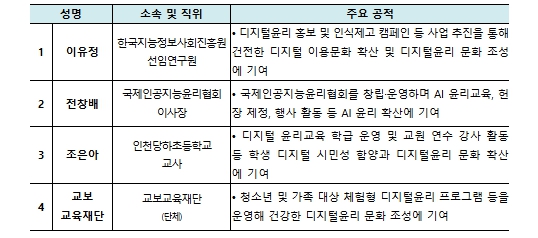 ‘디지털윤리 문화조성 유공’ 표창에는 디지털윤리 교육 및 인식 제고에 기여한 공로로 이유정 한국지능정보원 선임과 전창배 국제인공지능윤리협회 이사장, 조은아 인천당하초등학교 교사, 교보교육재단(단체)이 선정됐다.