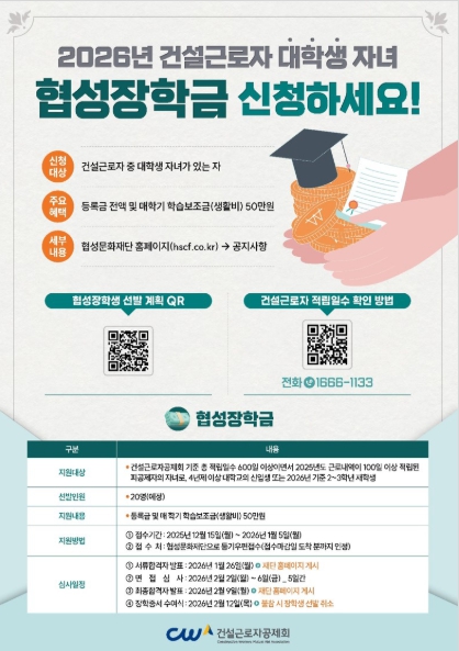 지원대상은 건설근로자공제회에 등록된 건설근로자로 총 적립일수가 600일 이상이고, 2025년도 근로내역은 최소 100일이다. 건설근로자의 자녀 가운데 국내 4년제 대학 신입생과 2026년 기준 2~3학년 재학생을 대상으로 장학생을 모집한다. 선발 인원은 20명 내외다. 제출서류, 심사기준은 협성문화재단 홈페이지 내 공지사항을 통해 확인할 수 있다.