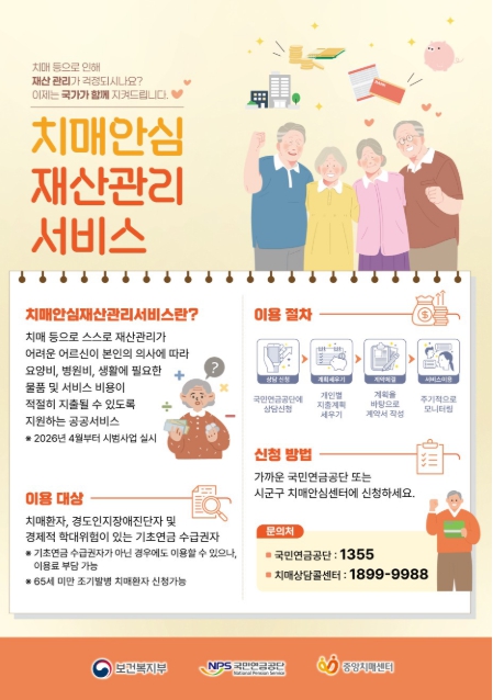임을기 보건복지부 노인정책관은 “치매안심재산관리서비스는 혼자서 감당하기 어려웠던 치매 어르신의 재산 관리를 국가가 함께 동행하며 지켜드리는 든든한 보호막이 될 것이다”라며, “어르신들이 본인의 재산을 자신의 안전하고 건강한 노후를 위해 온전히 사용할 수 있도록 제도 정착에 최선을 다하겠다”라고 밝혔다.