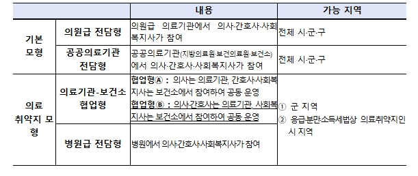 이번 공모에 신설된 모형을 포함한 재택의료센터 참여 모형은 다음 표와 같다.