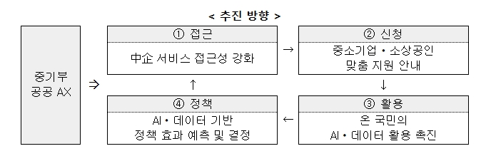 이에 중기부는 공공 AX 전환을 통해, 서비스 접근부터, 사업 신청, 인공지능(이하 AI)‧데이터 활용, 내부 정책 집행까지 전 과정을 통합 지원하는 체계를 구축할 계획이다.