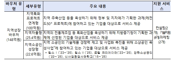 지역성장바우처는 지원 대상에 따라 3가지 유형으로 구분되며, 레전드50+ 프로젝트 참여 기업지역특화연계형(100억원), 지역의 전통 제조업체지역자율형(25.4억원), 기업가형 소상공인 육성사업 참여기업지역소공인성장형(22.6억원)이 주요 지원대상이다.