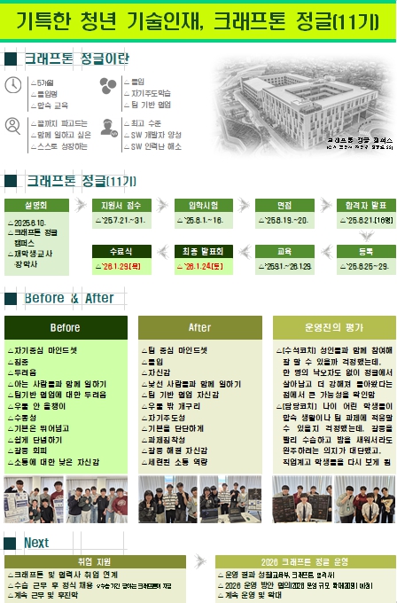 그간 성인 학습자들에게만 개방하던 크래프톤 정글 과정은 지난해 9월 시작된 11기 때 처음으로 직업계고등학교(이하 직업계고) 재학생에게 문을 열었다. 교육과정 설명회('25.6월), 온라인 입학시험과 면접('25.8월)을 거쳐 16명의 합격자를 선발했고, 합격자들은 지난해 9월부터 올해 1월까지 5개월간의 프로그램에 참여해 1월 29일(목) 모든 과정을 수료했다.