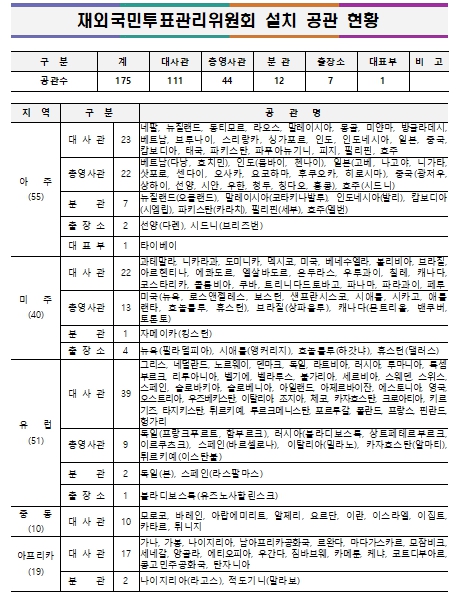 전쟁․폭동 등으로 인해 주재국 정세가 불안한 ▲주아프가니스탄이슬람공화국대사관 ▲주우크라이나대사관 ▲주레바논공화국대사관 ▲주리비아대사관 ▲주사우디아라비아왕국대사관 ▲주젯다총영사관 ▲주두바이총영사관 ▲주예멘공화국대사관 ▲주오만왕국대사관 ▲주이라크공화국대사관 ▲주이라크공화국아르빌분관 ▲주쿠웨이트국대사관 ▲주수단공화국대사관 등 13개 공관에는 재외국민투표관리위원회를 설치하지 않는다.