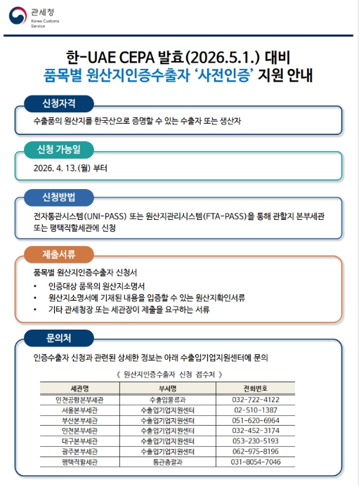 이명구 관세청장은 “우리 기업들이 차질 없이 협정을 활용할 수 있도록 행정적 지원을 아끼지 않겠다”며, “우리 기업들의 협정 활용을 돕기 위해 5월 7일 '한-아랍에미리트연합국(UAE) 포괄적경제동반자협정(CEPA) 활용을 위한 온라인 설명회'도 개최할 예정이니 많은 기업이 참여해 주시길 바란다”고 덧붙였다.