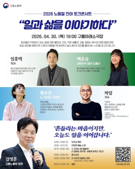 임홍택 작가의 사회로 진행된 이번 토크콘서트는 가수 하림, 청년도배사 배윤슬, 프리랜서 황효진 등 다양한 노동 형태를 대표하는 패널들이 참여했다. 특히 김영훈 장관이 직접 무대에 올라 청년들과 눈높이를 맞추며 ‘꿈꾸는 기관사, 노동자 출신’ 장관으로서 소회 등을 솔직하게 이야기하며, 공감대를 형성해 큰 호응을 얻었다.
